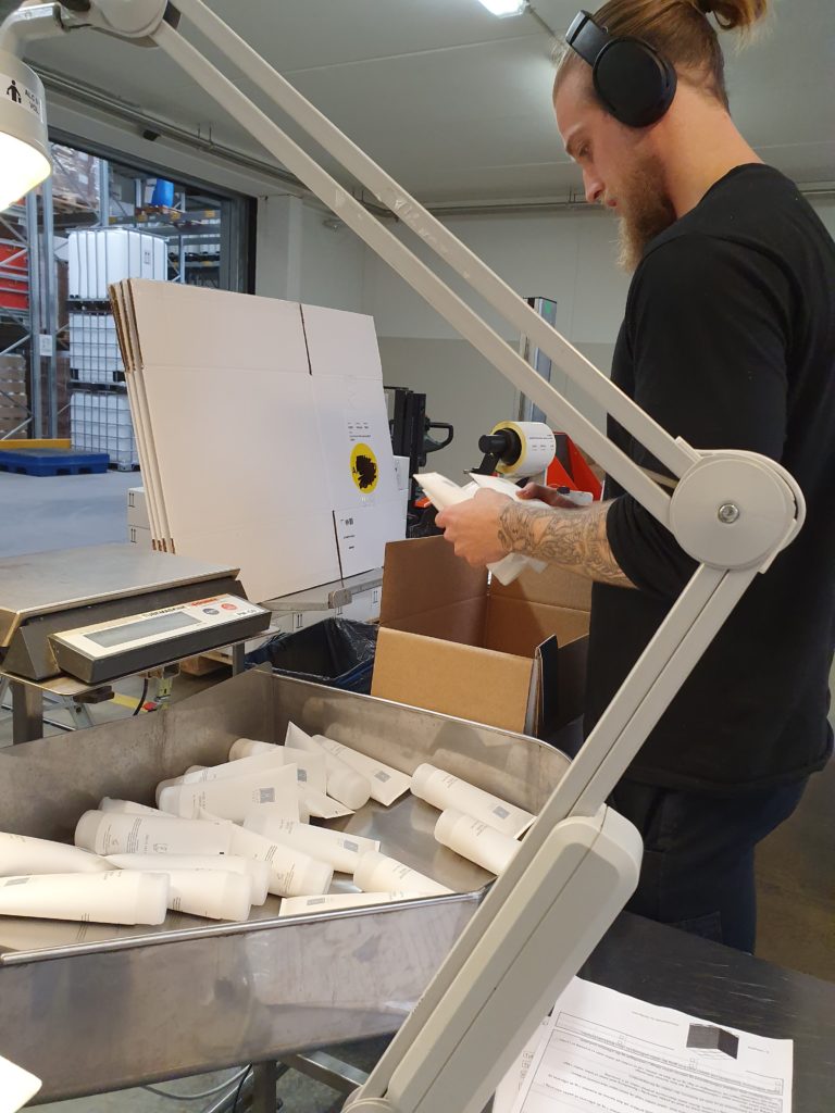 The product can now go into production. It has to be sold, it has to be packed. We pack all products manually. We have one in the team who checks all the tubes and packaging: Is the weld correct? Is the logo straight? We always have at least one package on this task – and when there are peak periods, of course, we have more. Everything happens manually. In fact, this also applies to our perfumes. They are hand-filled, checked and then packed.